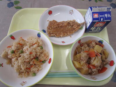 牛乳 大豆入り五目ご飯 いわしの竜田揚げ 肉じゃが