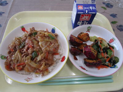 風邪に良いビタミンを含んでいる野菜はにんじんです。今日の給食ではホイコーローに使いました。もとは中国の四川省の料理ですが、漢字では回す肉の鍋と書きます。回すとは戻すという意味で、豚肉のかたまりを茹でたり蒸したりして火を通し、鍋に戻して炒めることからこの名前が付いたそうです。本場ではトウバンジャンを使いますが、日本では甘いテンメンジャンで、日本人の味覚に合うように変えています。今日はホイコーローの調理にも大学芋にも油を使いました。油で肉や野菜を炒めると油が肉や野菜の表面に膜を作り、水分やうま味が逃げるのを防ぎます。ほかにも色を鮮やかにしたり、野菜の食感をよくしたりすることができます。