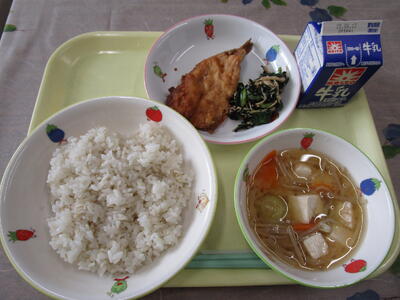 牛乳 ご飯 鰯のガーリック揚げ ほうれん草の磯あえ みそ汁