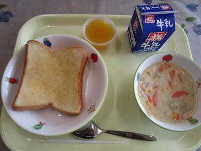 牛乳 ハニートースト 米粉のシチュー オレンジゼリー