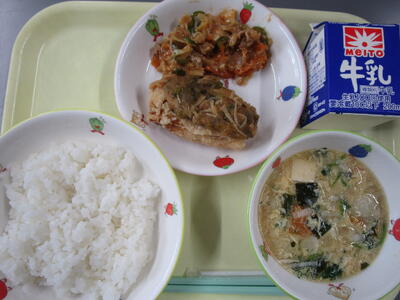 ごはん、タチウオの和風ソース、キャベツのみそ炒め、かきたま汁