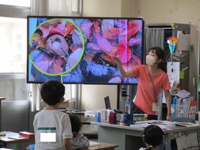 1年生、国語の説明文「だれがたべたのでしょう」の学習です。教科書を広げる前に、写真を画面に映し出し、先生から「だれがたべたのかな」「これはなんだろう」と問いかけると、子供たちは「かじったあとだ」「実だ」と考えたことを発言していました。説明文を読む意欲が高まりますね。