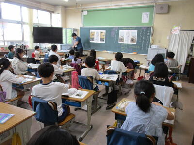2年生、国語で同じ場面の時間が経過した2枚の写真を見比べて、何がその間におこったのか考えてノートにかいています。写真からわかることを読み取ることも、大切な力ですね。