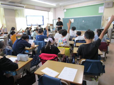 4年生、グリーンスクールの予定を子供たち自身で読んだ後に、先生が質問をして答えています。意欲満々です。