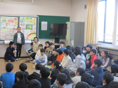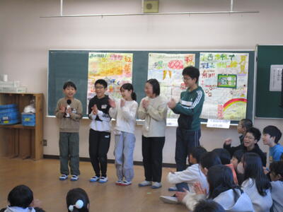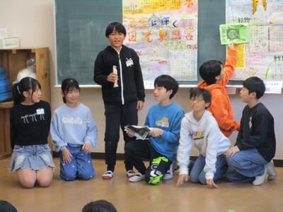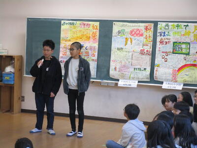 6年生が5年生に向けて修学旅行について交流会を行いました。グループでまとめた新聞を掲示し、ナレーター2人が息の合ったかけあいと進行で楽しく場を盛り上げていました。とろどころクイズも入ってくるので、みんなを飽きさせない工夫もあり、良い交流会となりました。5,6年生の交流は校内音楽会でも行われていました。このように同学年だけでなく異年齢の交流は、大変意義のある事ですね。