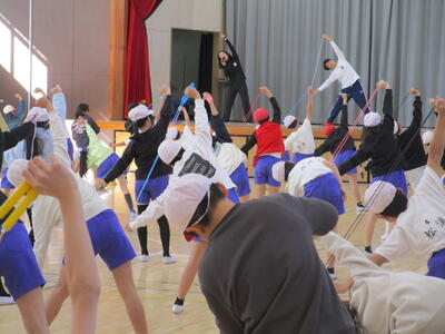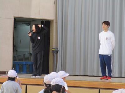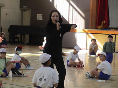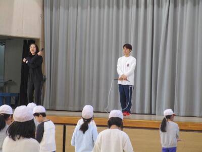 4年生、5年生.、6年生の縄跳び教室が行われ、「柏なわとびクラブ」から2人の先生にお越しいただきました。このクラブにはたくさんのチャンピオンがいるそうなのですが、世界大会で何度も優勝経験のある先生が実際に手本を見せて教えてくださいました。前跳び、後ろ跳び、あや跳び、交差跳び、二重跳びと短い時間の間にコツを教えていただきました。みるみるうちに子どもたちが上達していきます。跳べるようになりたいという気持ち、縄跳びに向き合うことが大事だそうです。