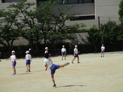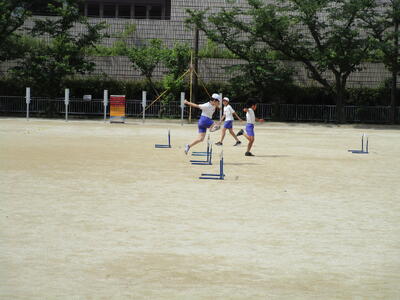 6年生、校庭で「ジャべリックボール」を使って投げる練習をしていました。次に日陰に行って、説明を聞き、走る前の準備運動をしてからハードル走の練習です。今日は暑いので練習の合間に自由に水分を補給しながら、学習に取り組んでいました。