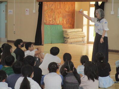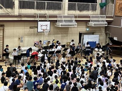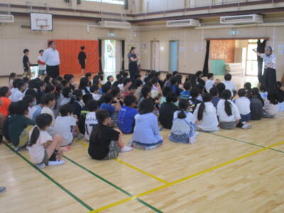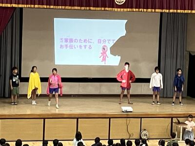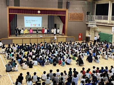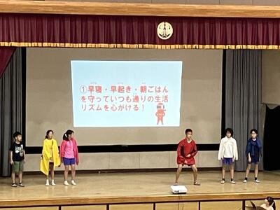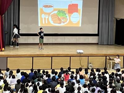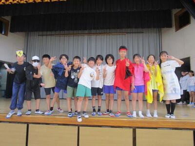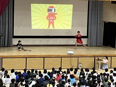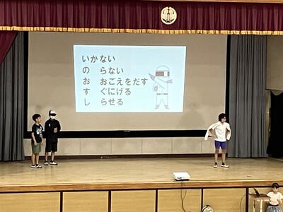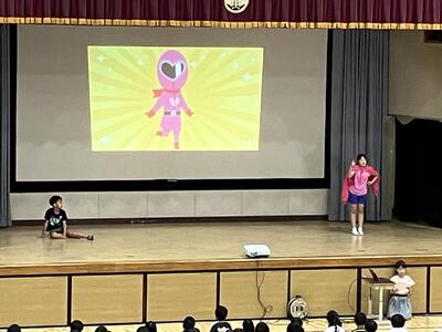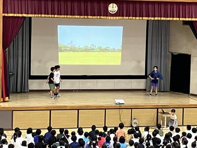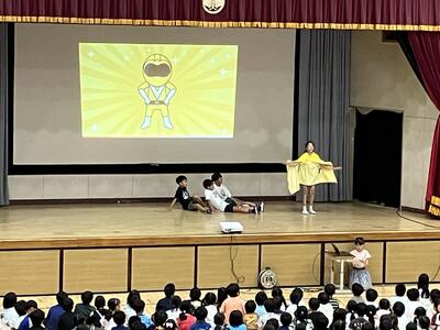 夏休みを迎える会に「大和田レンジャー」が参上しました。夏休みの生活で気を付けることを、6年生が劇にして全校のみんなに伝えてくれました。わかりやすいので、みんながよく見て、聞いてくれているなと感じました。是非、気をつけて生活してほしいです。退場の際の吹奏楽部の演奏、大変、素敵でした。