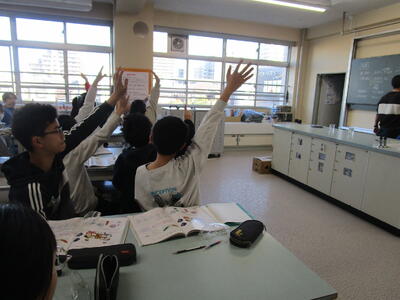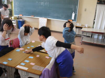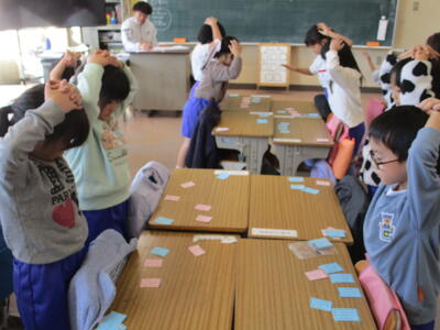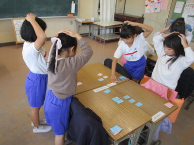 1月に百人一首大会を行いますが、練習が始まりました。先生が読んだ歌を聞いて、各グループごとに札をとっていきます。1年生は練習を始めて間もないはずですが、なんだか形になっていて、頭に手を置くルールでみんな楽しんでいました。