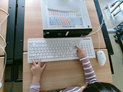 学校での初めてのパソコン学習は、キーボードやマウスの使い方など、まだまだ慣れない様子でしたが、少しずつ操作の方法を身に付けていけるよう支援していきます。