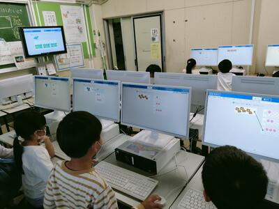 1年生は、まだタブレットが配付されていないので、学校のパソコンの起動方法やジャストスマイルドリルの使い方について学びました。