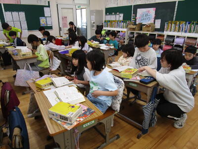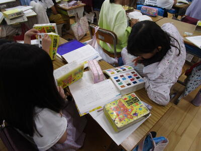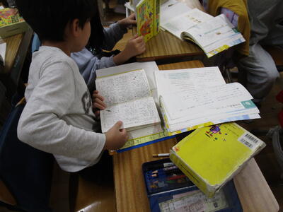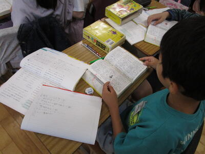3年生の国語科の学習の様子です。国語辞典を使って言葉の意味を調べていました。出された問題を辞典で調べる前に「言い切り」の形にすることに気を付け、先生と考えながら調べていました。友だちとも協力しながら、一生懸命に取り組んでいる姿も見られました。