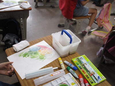 2年生、教室で図工「不思議な生き物があらわれた」をやっていました。白いクレヨンで描いた下絵が絵の具を塗ることで浮き出てくると、子供たちもとてもうれしそうです。