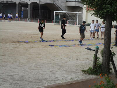 朝から5.6年生陸上部が、種目別に分かれて練習に取り組んでいます。種目は短距離・走り幅跳び・走り高跳びです。走り高跳びは6年生だけの種目になるので、走り幅跳びを練習している児童が多いです。5年生の体育の時間に走り幅跳びをやっているのも影響しているかもしれません。