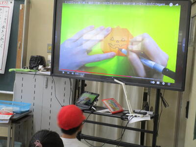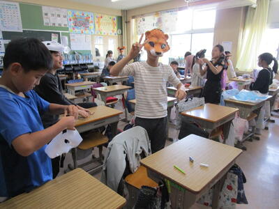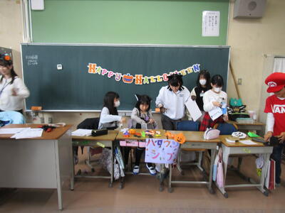 今日はハロウィン、様々なクラスでそれを感じました。1年生では、カボチャの折り紙をおっていたり、4年生では外国語の授業を仮装して受けていたり、ハロウィンパーティーの準備をしたりしていました。そんな中、5年生のあるクラスでは、ハロウィンパーティーをやっていました。射的やボーイング、箱の中の綿の中に隠されている折り紙を探すゲームなど・・・。子供たち、楽しんでいました。