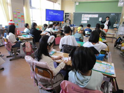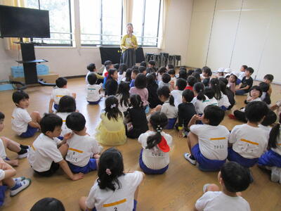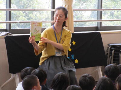 業間休みには、のびのびできらきら星さんによる、1.2年生の児童への読み聞かせがありました。とても楽しいお話だったので、子供たち笑顔で聞いていました。