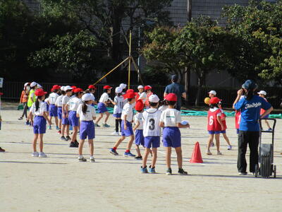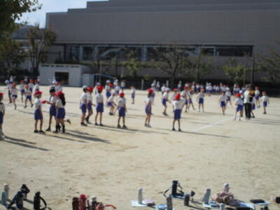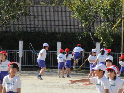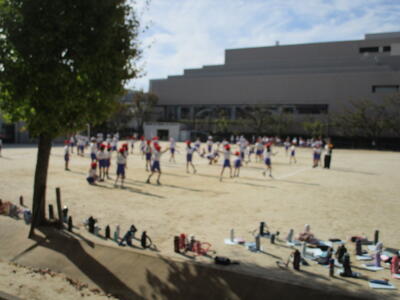 校庭では、秋晴れの中、2年生全クラスがボール運動、3年生の1クラスが鉄棒運動、縄跳びをやっていました。