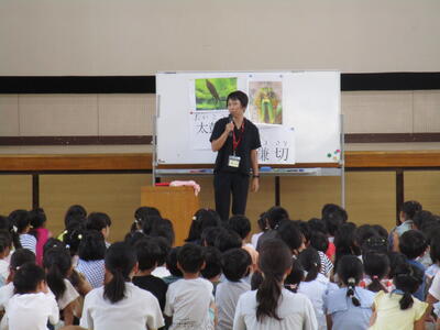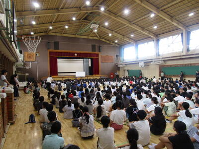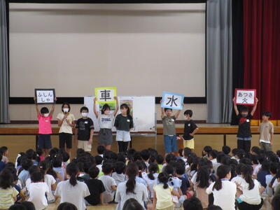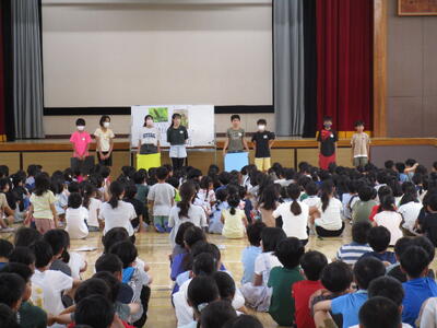 夏休みを迎える会が全校で集まり体育館で行われました。「校長先生の話」では、4月から今日までを振り返ってみると皆が本当に成長したという話と夏休み中に何か一つ自分の好きなことに取り組んでほしいという話がありました。「夏休みの生活について」は、生徒指導の先生とそのクラスの児童から色を使って、とてもわかりやすい話がありました。赤は「火や暑さ、熱中症」水色は「水の事故」黄色は「車・自転車の事故」黒は「不審者」です。自分で自分の命を守りながら、楽しい夏休みにしましょうというまとめの話も低学年の児童もうなづきながらしっかりと聞いていました。