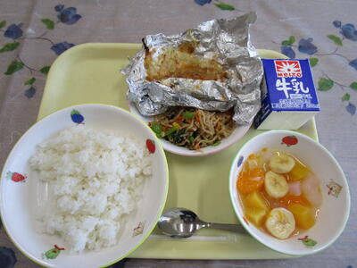 牛乳 ご飯 鮭のちゃんちゃん焼き 白滝ソテー フルーツポンチ