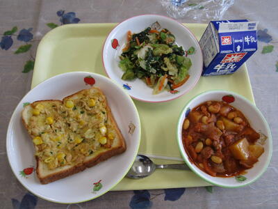 牛乳 ツナコーントースト ポークビーンズ 海藻サラダ