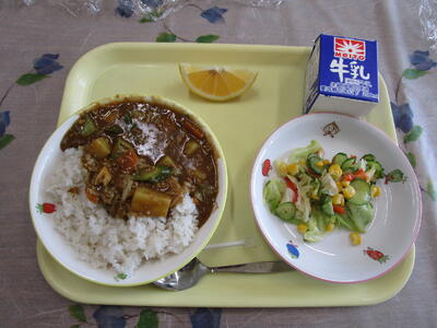 今日の給食はカレーライスです。具は季節の野菜がいろいろ入っています。たけのこ・キャベツ・・・全部見つけられるでしょうか。ジャガイモ・人参・玉ねぎも、とれる地域によって一番おいしい季節が春のものもあります。このように1年中とれる野菜は、季節によって産地をずらしながら収穫されています。今は暖かい九州・四国などの野菜が多くみられます。
