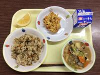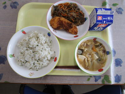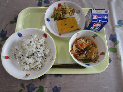 牛乳 わかめご飯 玉子のちぐさ焼き 春キャベツのとさ和え 生揚げとこんにゃくのピリ辛炒め