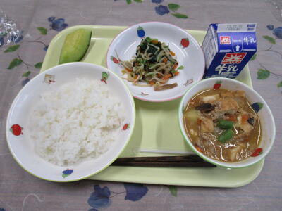 牛乳 ご飯 生揚げの肉みそ煮 いそか和え メロン