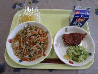 牛乳 豚肉とにらの焼きそば 肉団子のもち米蒸し ゴマ酢和え フルーツヨーグルト