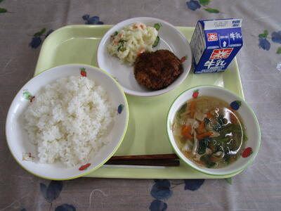 牛乳 ご飯 キャベツメンチカツ 豆入ポテトサラダ 野菜スープ