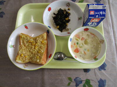 牛乳 ツナコーントースト ホワイトシチュー ひじきのマリネ