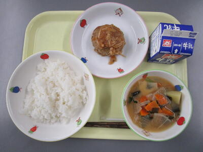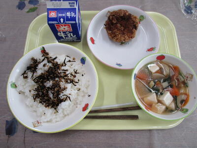 牛乳 ご飯 ひじきのふりかけ キャベツメンチカツ のっぺい汁
