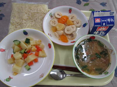 牛乳 ハムとコーンのバターラーメン マセドアンサラダ フルーツポンチ