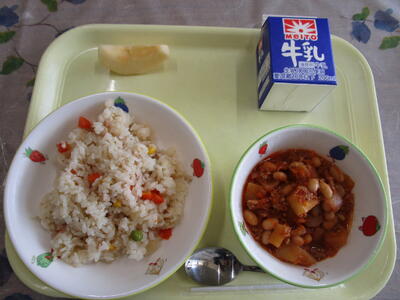 牛乳 ハムピラフ チリ・コン・カーン リンゴ