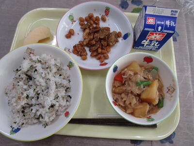 牛乳 わかめご飯 肉じゃが ビーンズ牛蒡 リンゴ