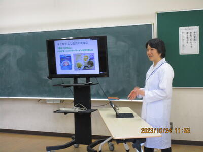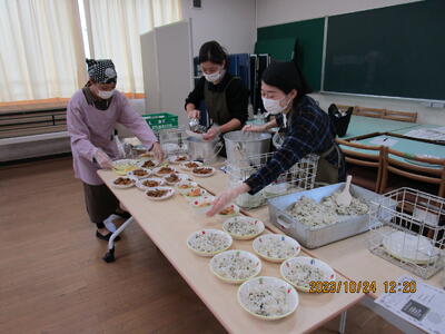 昨日、のびのびルームでPTA主催の給食試食会がありました。栄養士の松丸先生から、給食を作る過程やメニューについてなどの説明の後、実際に給食を試食しました。