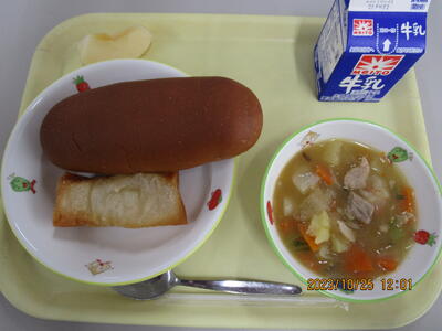 牛乳 黒糖パン ポトフ 豆とツナのパイ風春巻き リンゴ