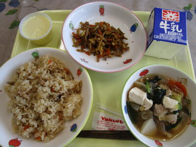 牛乳 鶏ごぼうご飯 あげじゃが入りきんぴら けんちん汁 ルルとララのカスタードプリン