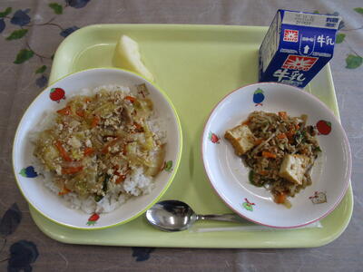 牛乳 麦ご飯 白菜のあんかけ丼(具) 生揚げとこんにゃくのピリ辛炒め リンゴ