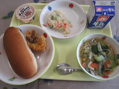 牛乳 コッペパン 白身魚のフライ 豆入りポテトサラダ 野菜スープ チョコプリン