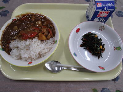 牛乳 麦ごはん チキンカレー ひじきのマリネ