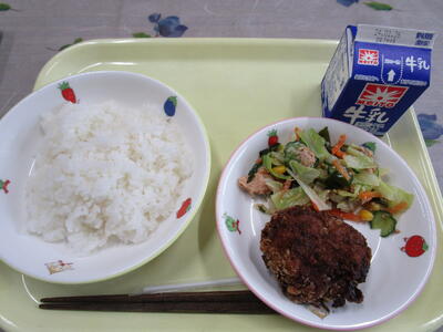 牛乳 ご飯 キャベツメンチカツ わかめサラダ
