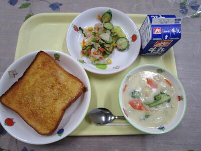 牛乳 フレンチトースト ホワイトシチュー カブのサラダ