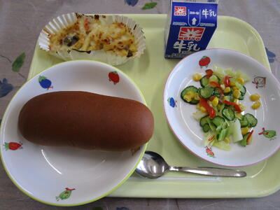 牛乳 黒糖パン こまったさんのグラタン コーンサラダ