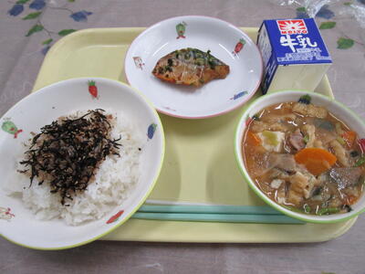 牛乳 ご飯 ひじきのふりかけ サバのピリ辛焼き さつま汁