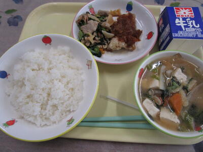 牛乳 ご飯 あじの南蛮漬け 豚肉と小松菜のオイスター炒め 豚汁