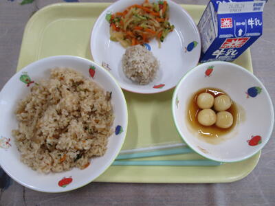 牛乳 五目御飯 もち米シュウマイ 野菜の中華漬け みたらし白玉団子