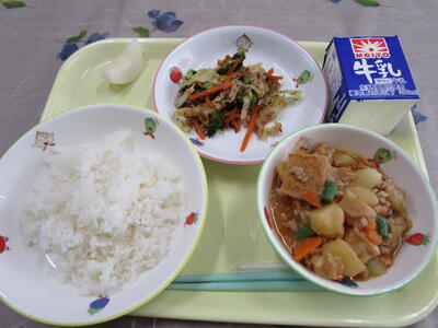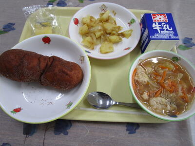 牛乳 ココア揚げパン 豆腐団子スープ ツナカレーポテト 冷凍パイン