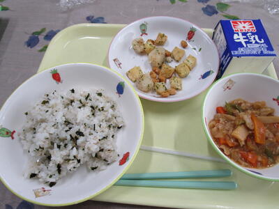 牛乳 わかめご飯 タラとポテトののり塩揚げ キャベツのみそ炒め