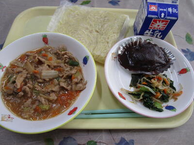 牛乳 あんかけラーメン 青菜のナムル おはぎ