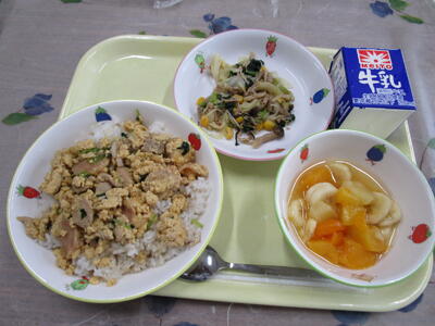 牛乳 麦ごはん 他人丼 キノコ野菜炒め フルーツポンチ